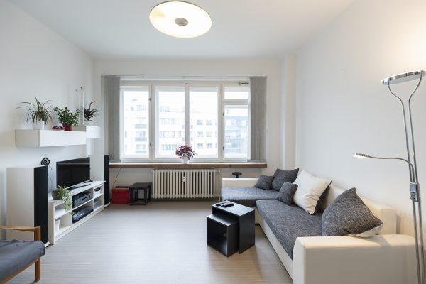 Dále je zde obývací pokoj, do kterého se dostanete jak z ložnice, tak i z kuchyně. Všechny tři místnosti jsou průchozí. Z obývacího pokoje je zároveň vstup na balkon (2,5m²).