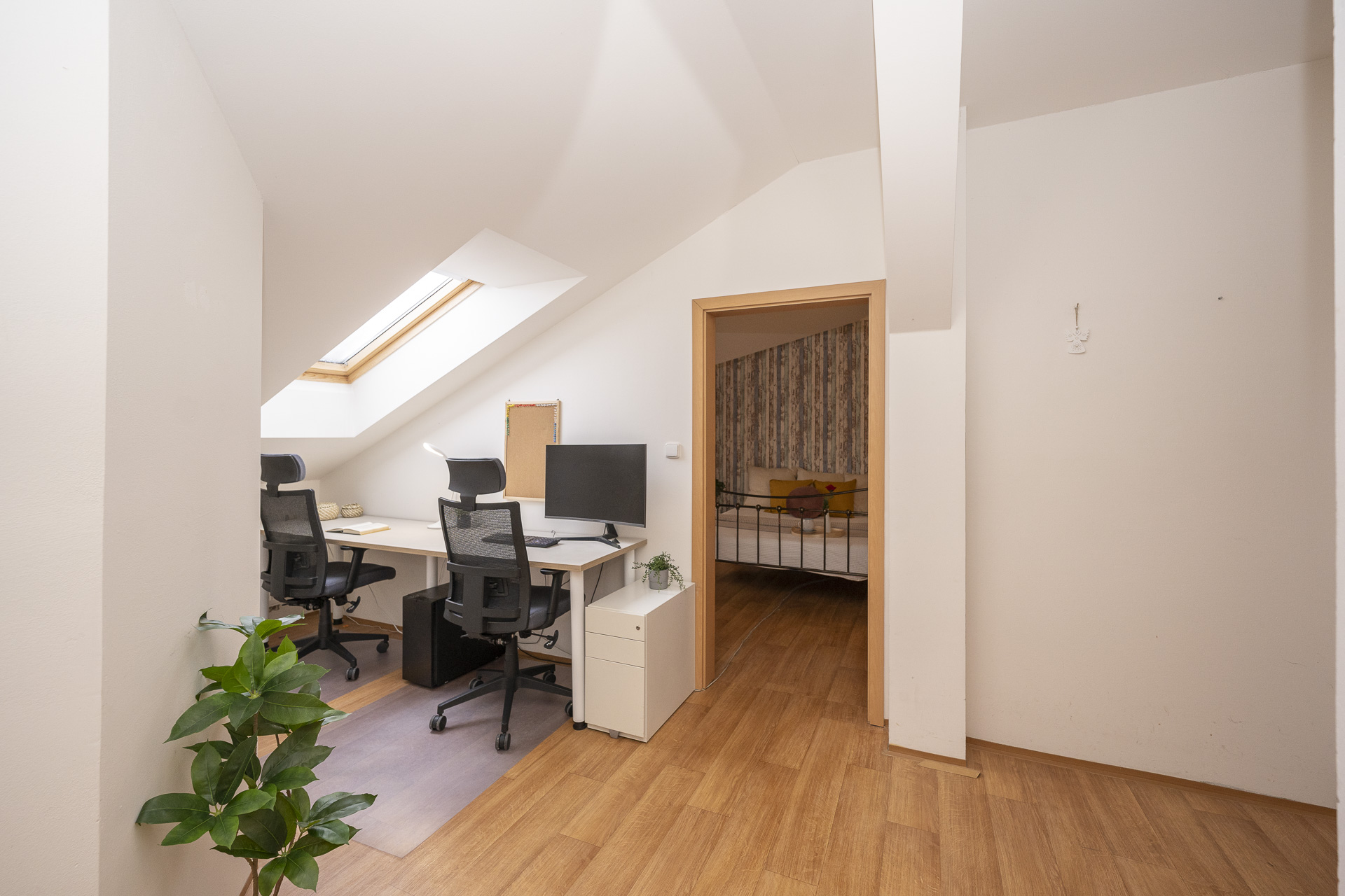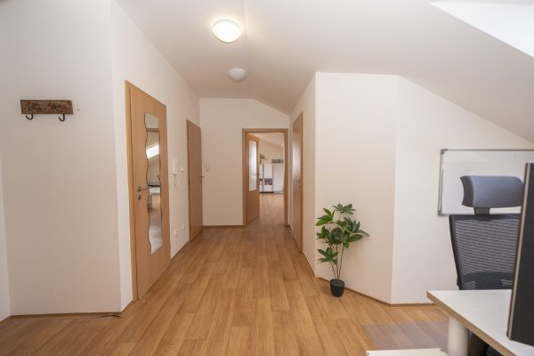 Při vstupu do bytu se ocitnete v prostorné chodbě, kde mají aktuální nájemníci efektivně vytvořenou pracovnu. Na chodbě se následně můžete rozhodnout do které místnosti vstoupit.