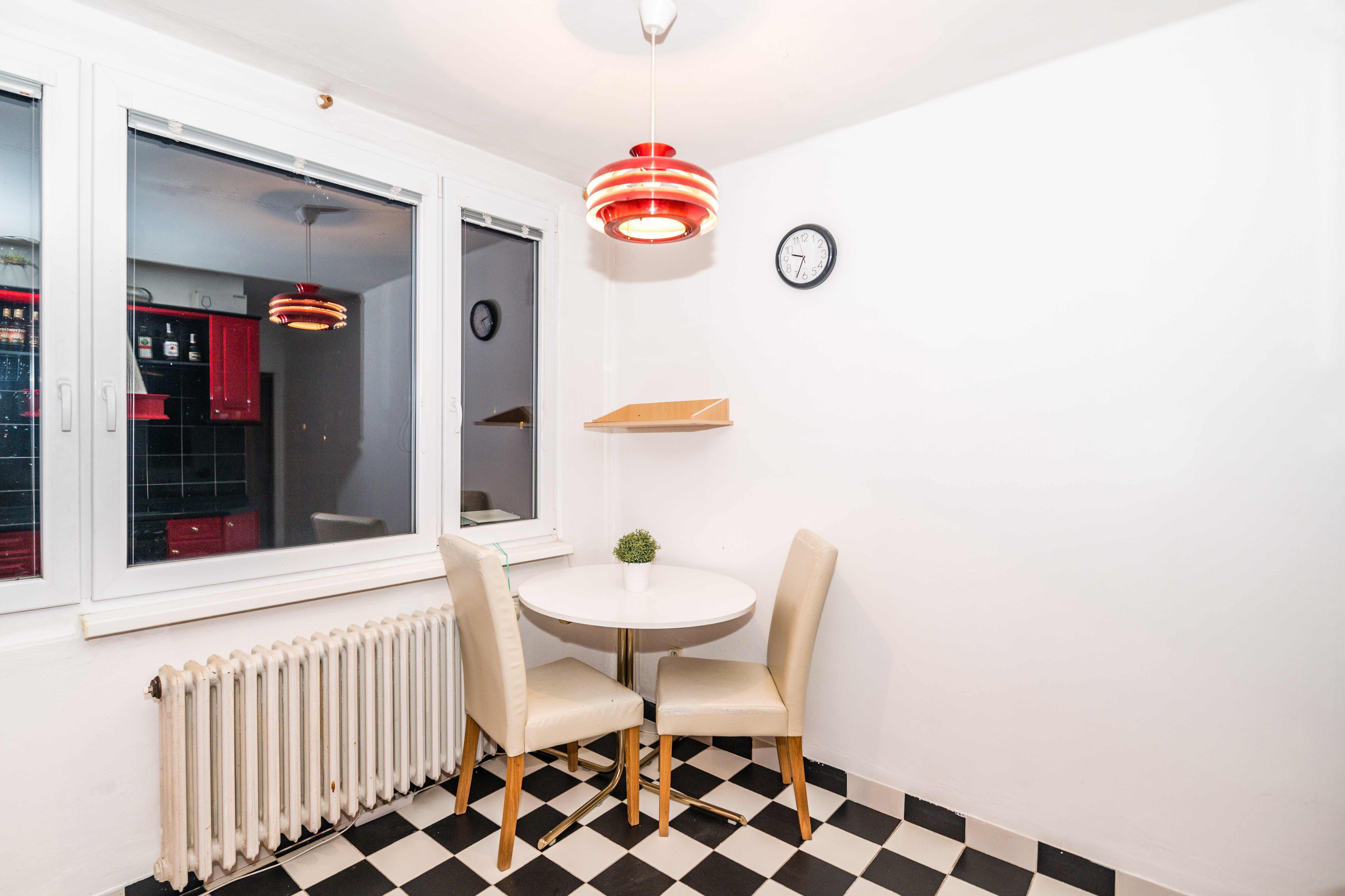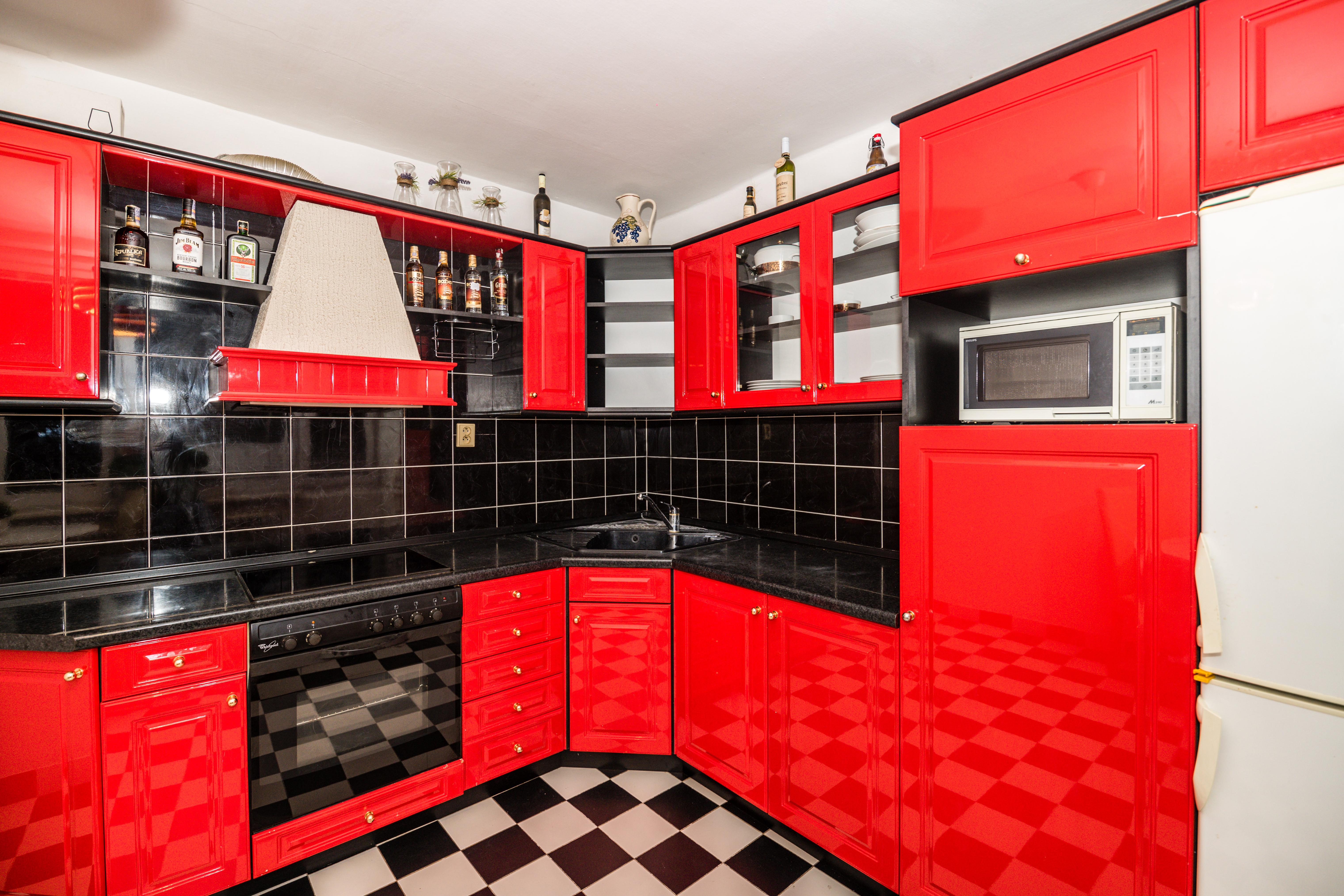 Kuchyň v netradičním červeném designu je společně s dřezem, lednicí, digestoří, sklokeramickou deskou, elektrickou troubou a mikrovlnnou troubou neodmyslitelnou součástí tohoto bytu.